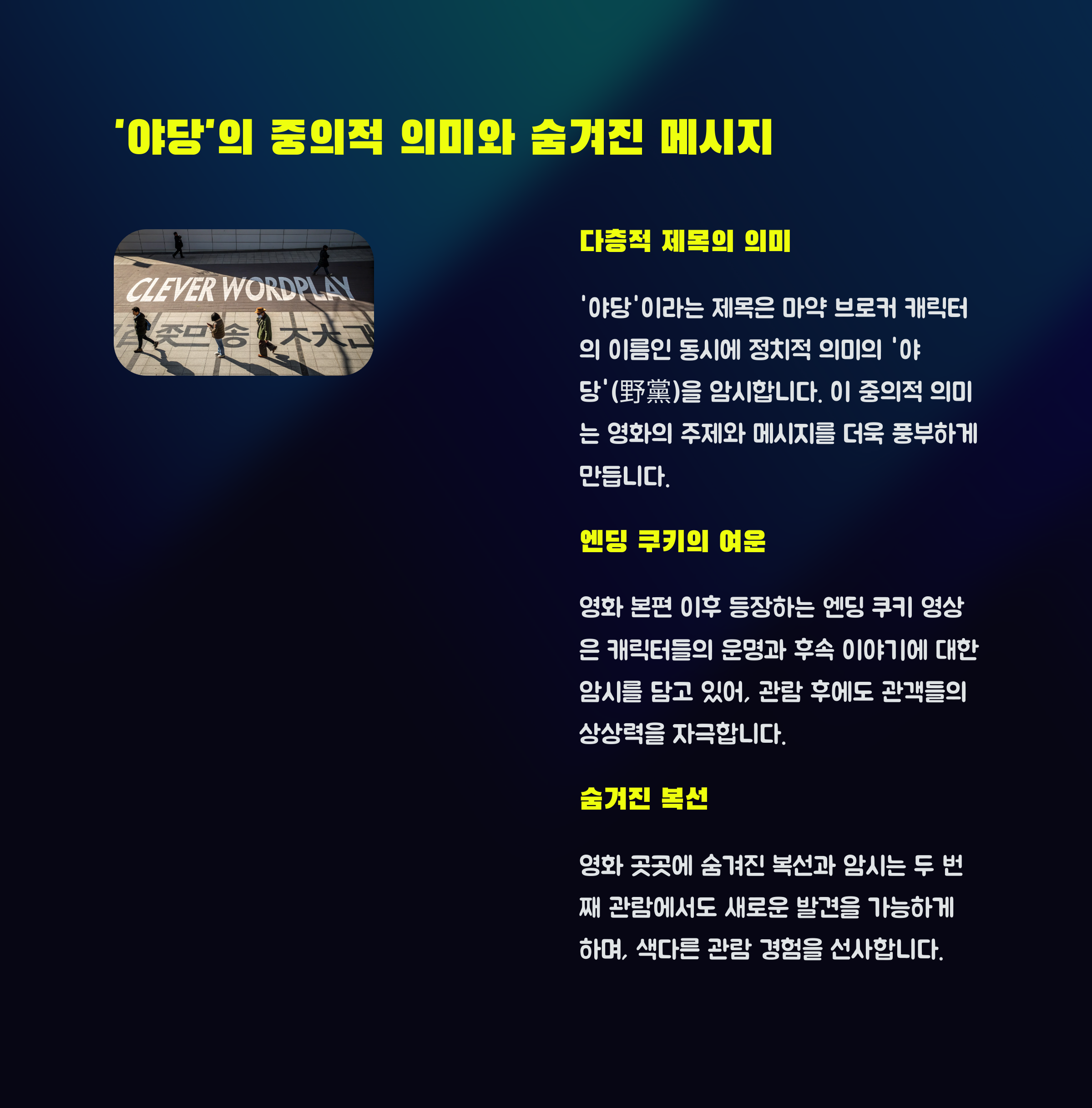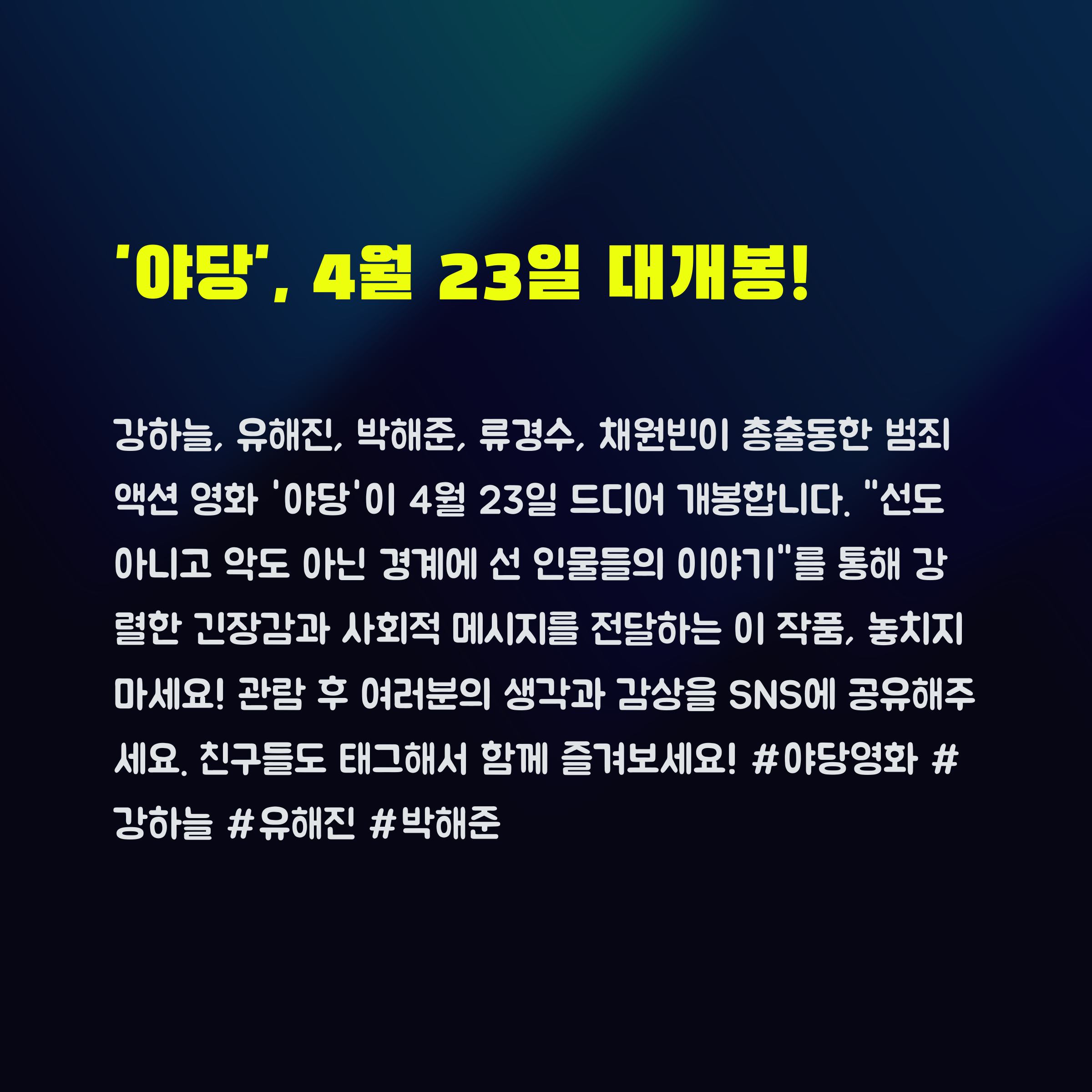 영화 ‘야당’을 관람하신 후 어떤 장면이 가장 인상 깊으셨나요? 여러분이 발견한 색다른 포인트나 해석이 있다면 댓글로 공유해주세요. 다양한 시선을 통해 함께 영화의 깊이를 더해가요!
