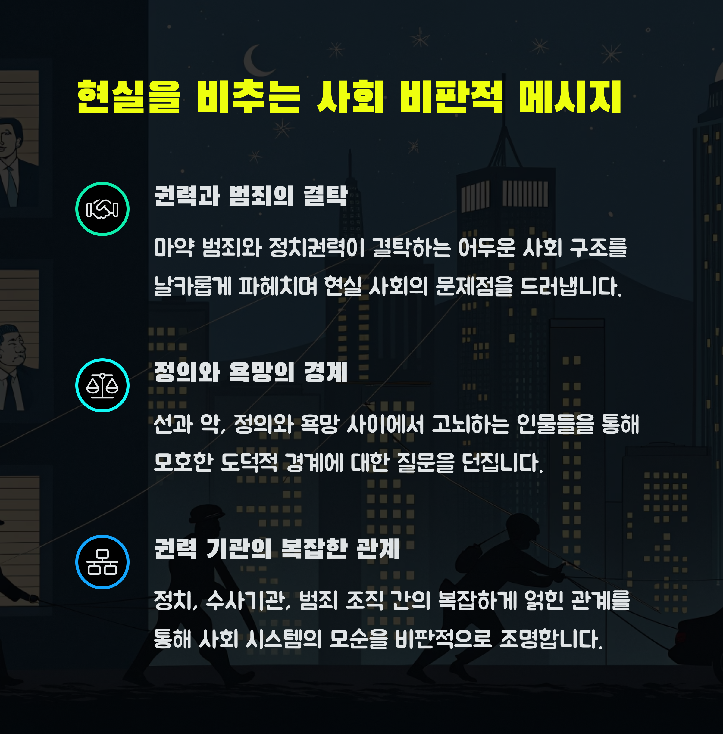 | 배우들의 캐릭터 해석이 뛰어납니다. | 반전을 이용한 전개가 돋보입니다. | 현실을 반영한 메시지가 공감을 줍니다. |