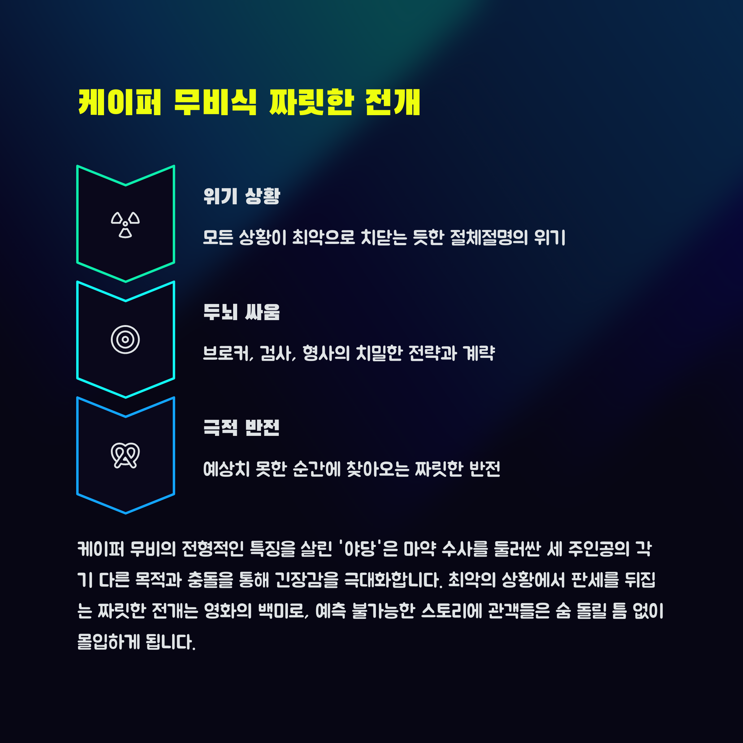 | 케이퍼 무비 전개 | 반전과 긴장감 넘치는 구성으로 관객을 사로잡습니다. |