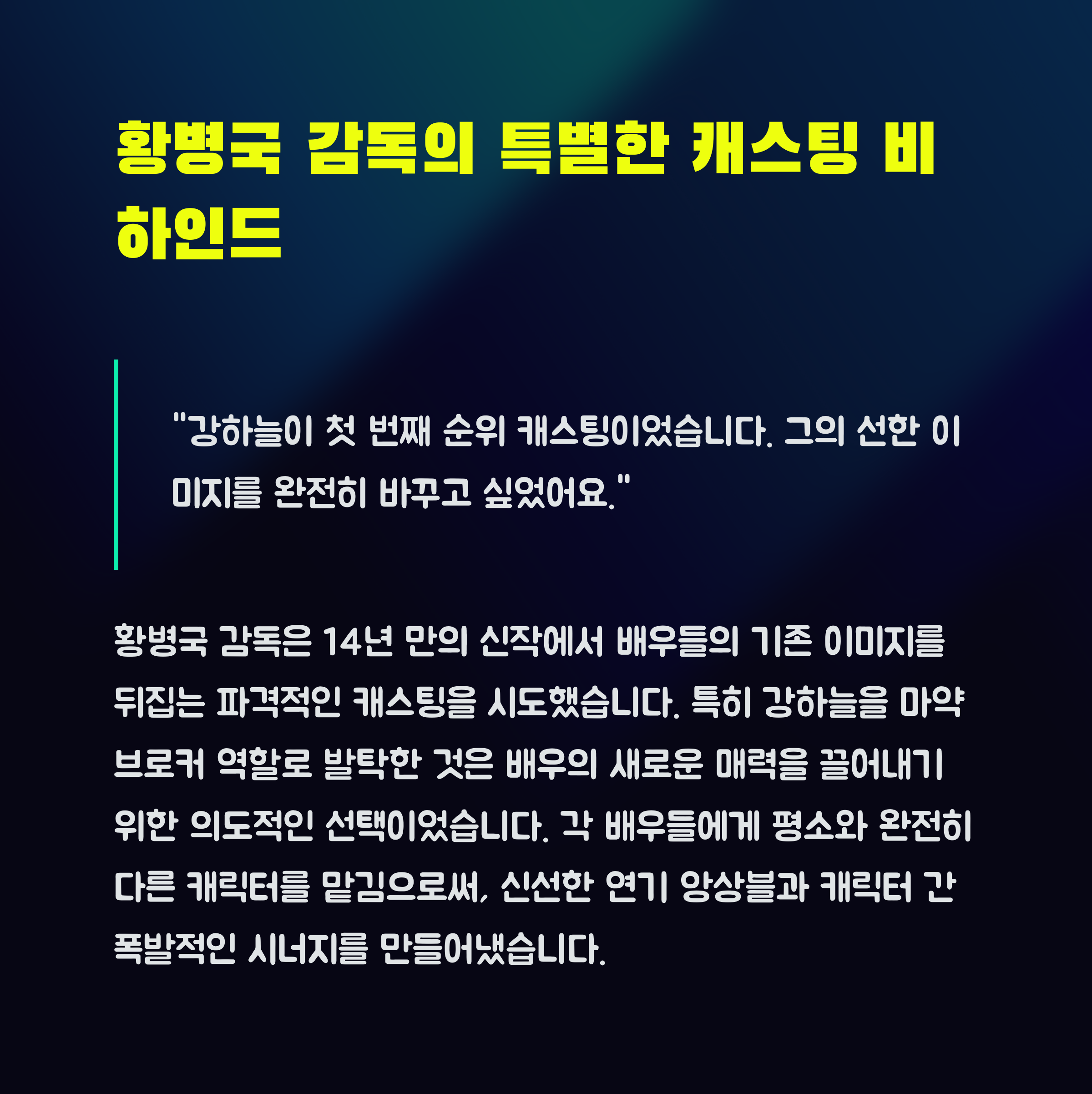 영화 ‘야당’은 단순한 범죄 스릴러의 틀을 뛰어넘어, 인간의 욕망과 정의, 권력 간의 긴장 관계를 섬세하게 그려낸 작품입니다. 특히 강하늘, 유해진, 박해준 등 연기파 배우들의 호흡과 몰입감 있는 연기는 스토리의 흐름을 더욱 자연스럽고 설득력 있게 만들어 줍니다. 관객은 그들의 표정, 눈빛, 목소리의 떨림 하나까지 따라가며 감정을 공유하게 되고, 그로 인해 영화 전반에 깔린 긴장감은 더욱 증폭됩니다.
